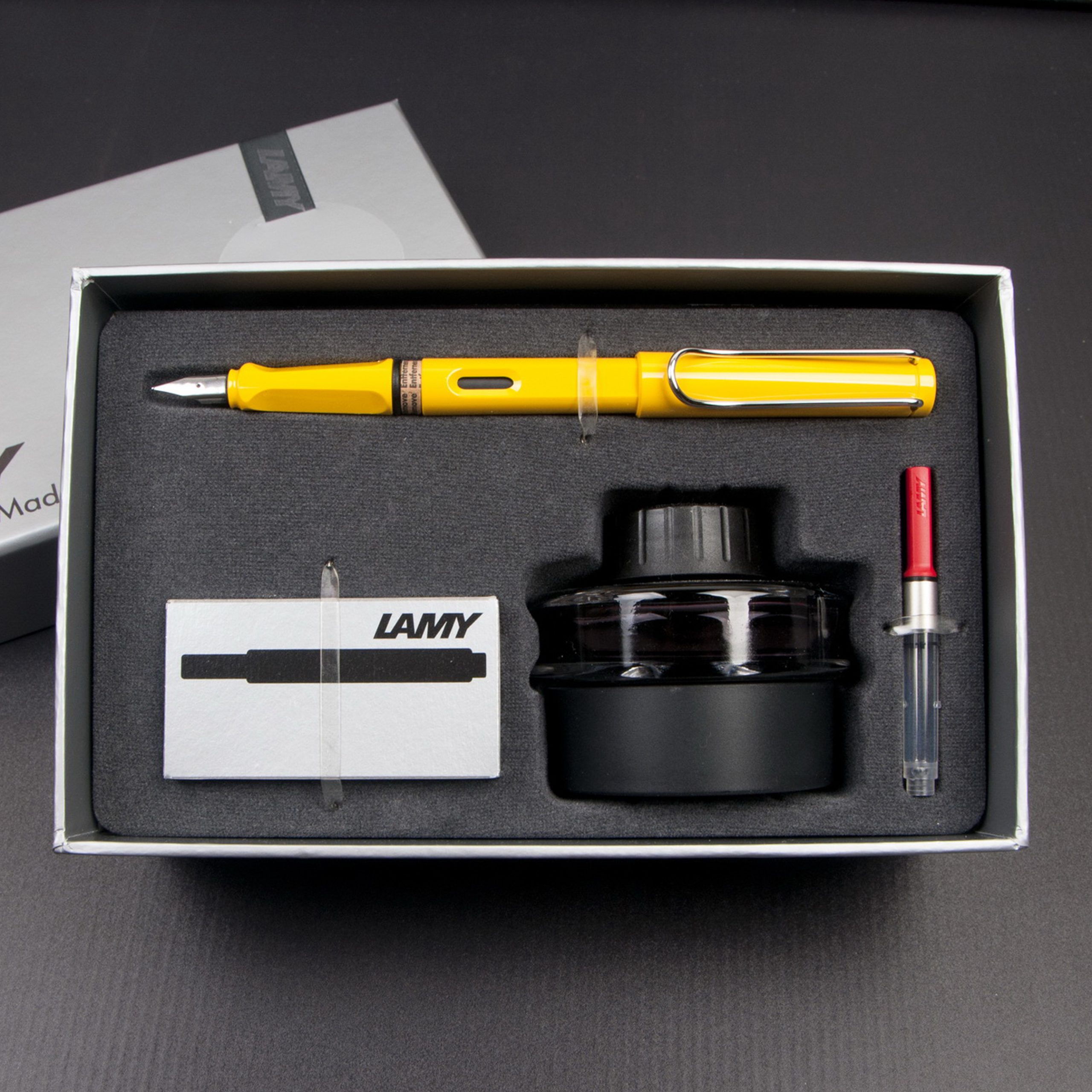 內含:鋼筆一支 / 吸水器一個 / T52墨水50ML一瓶 / T10卡水一盒,再以繽紛的鍛帶禮盒包裝,完整的組合與包裝,提供自用或送禮滿意的選擇。